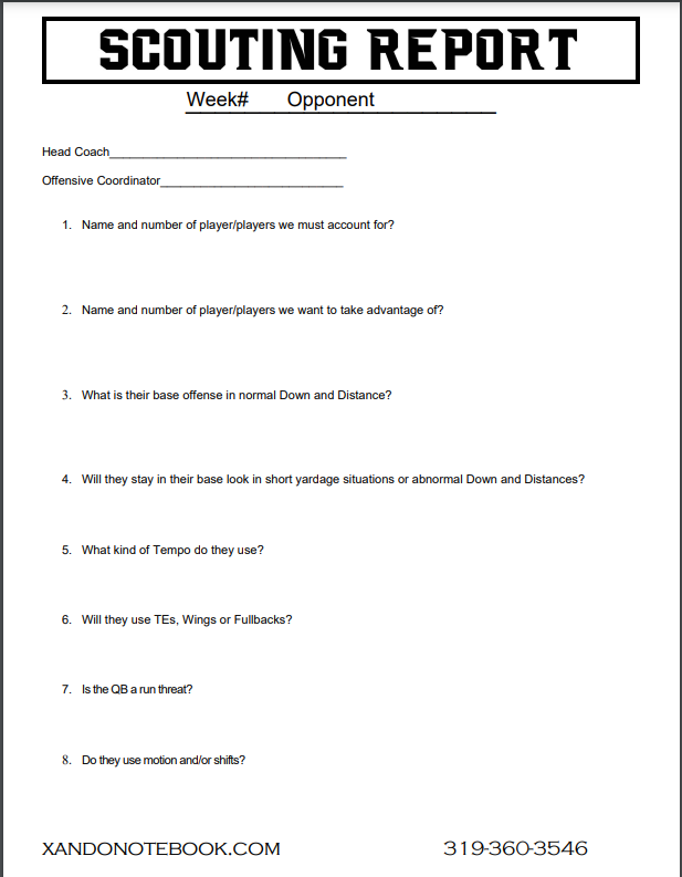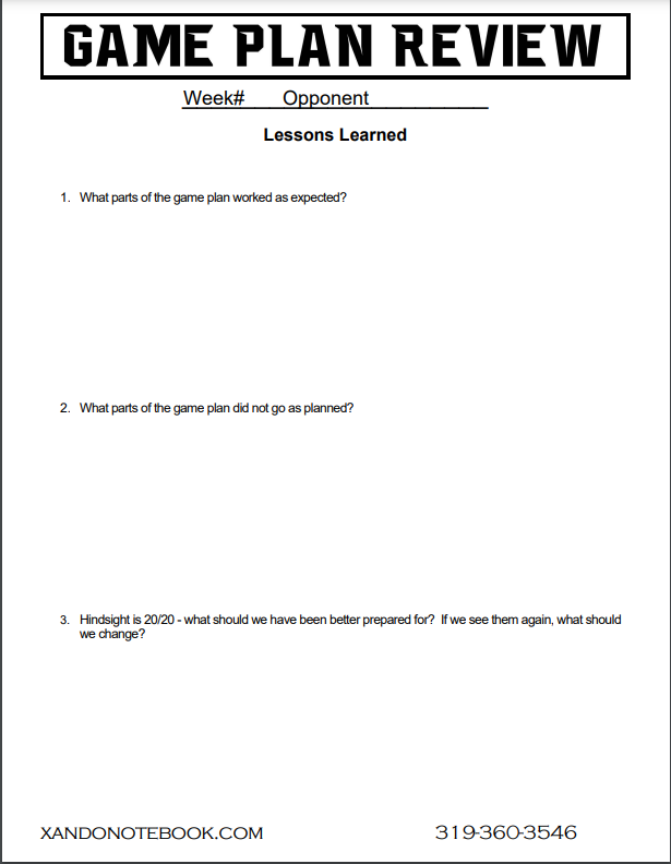 The last page of each weekly section will be a page dedicated to your film breakdown for that week’s game. Keeping your film breakdown notes separate from the other pages will help keep you organized and efficient.