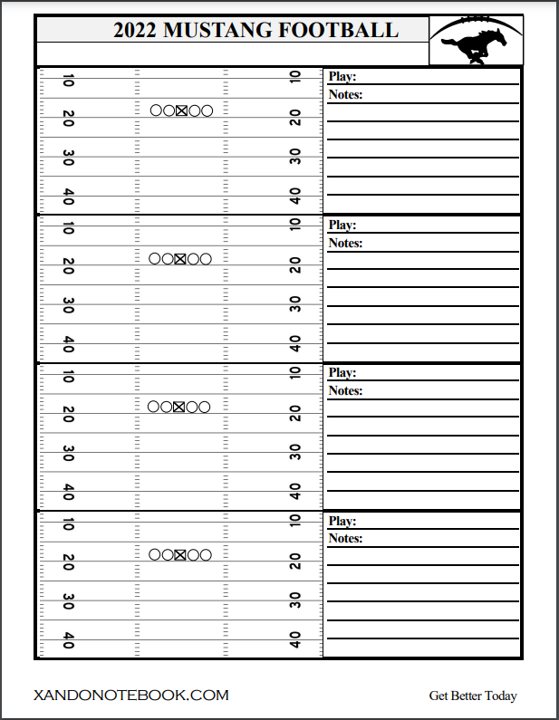 The play cards are what make the X and O Notebook so unique and desirable. The pages will be designed and built for your program with custom text, image and program motto. In addition, the play card diagrams will be specific to offense, defense or special teams. Each page will have four play cards, with the exception of special teams notebooks, that will have two play cards per page. Each individual play card has a notes section so your diagrams don’t get cluttered. These pages also have a title space at the top to keep ideas organized.